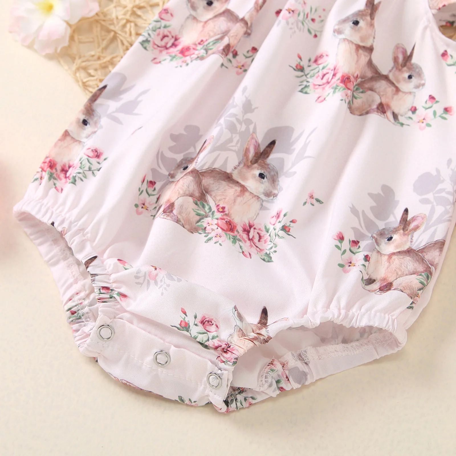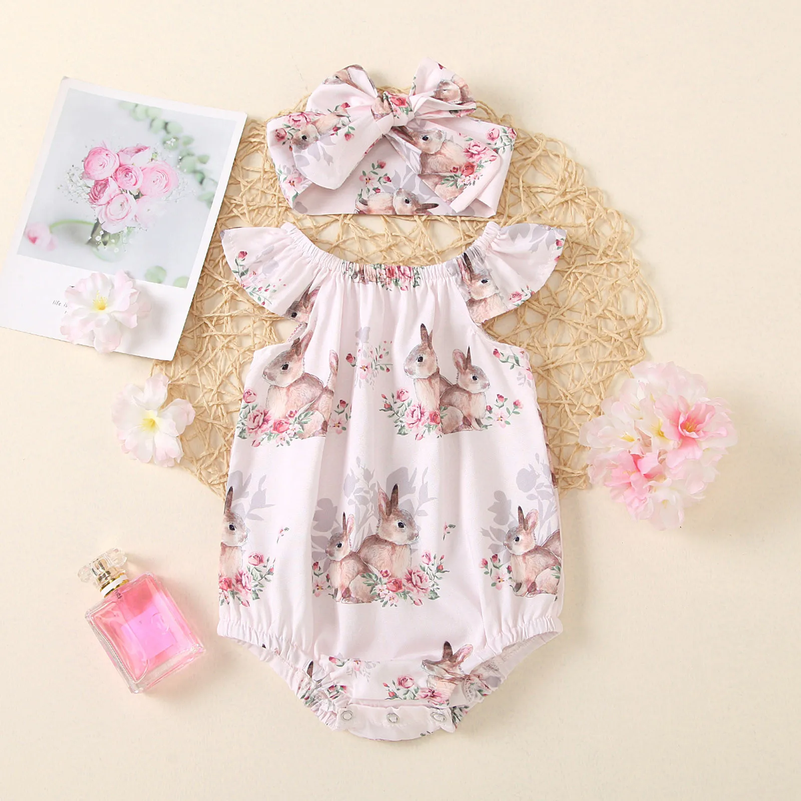 Infant Baby Girls Easter Day Bunny Printed Bodysuit Romper Headbands Sets