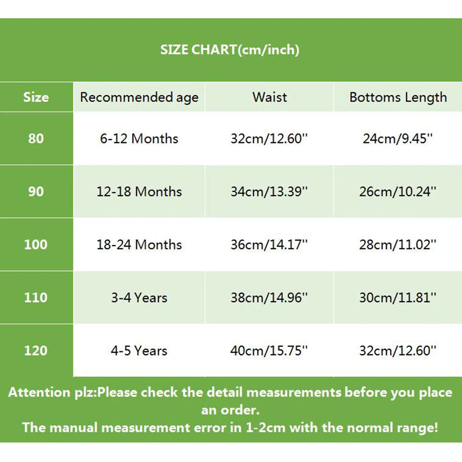 | Size:80 | Recommended age:6-12 Months | Waist:32cm/12.60” | Bottoms Length:24cm/9.45” |