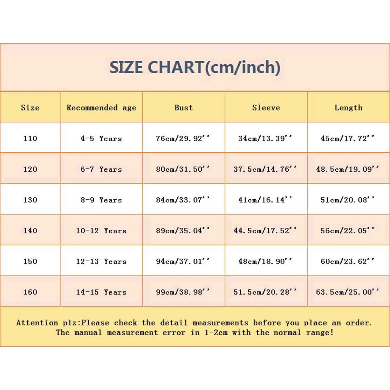 | Size:130 | Recommended age:8-9 Years | Bust:84cm/33.07” | Sleeve:41cm/16.14” | Length:51cm/20.08” |