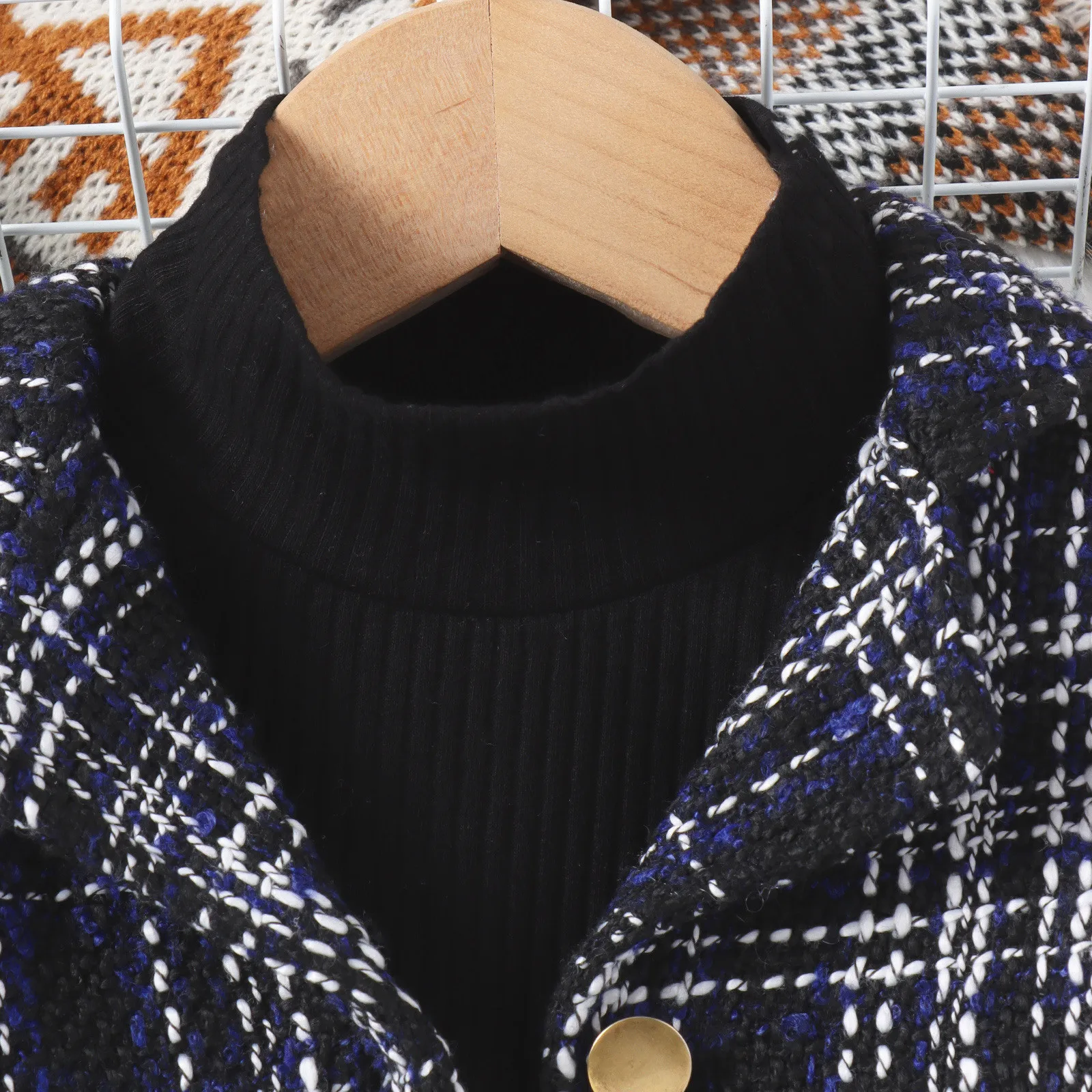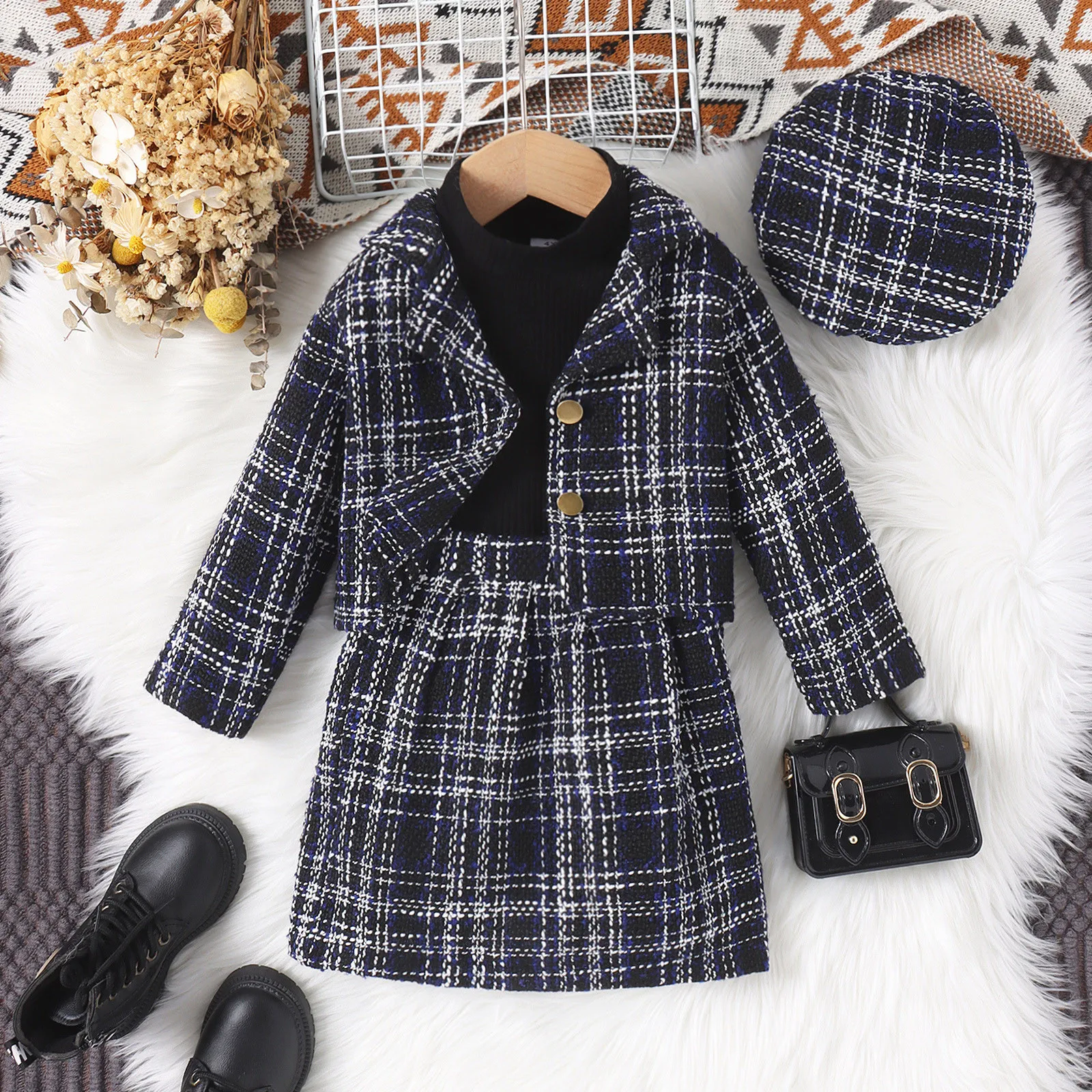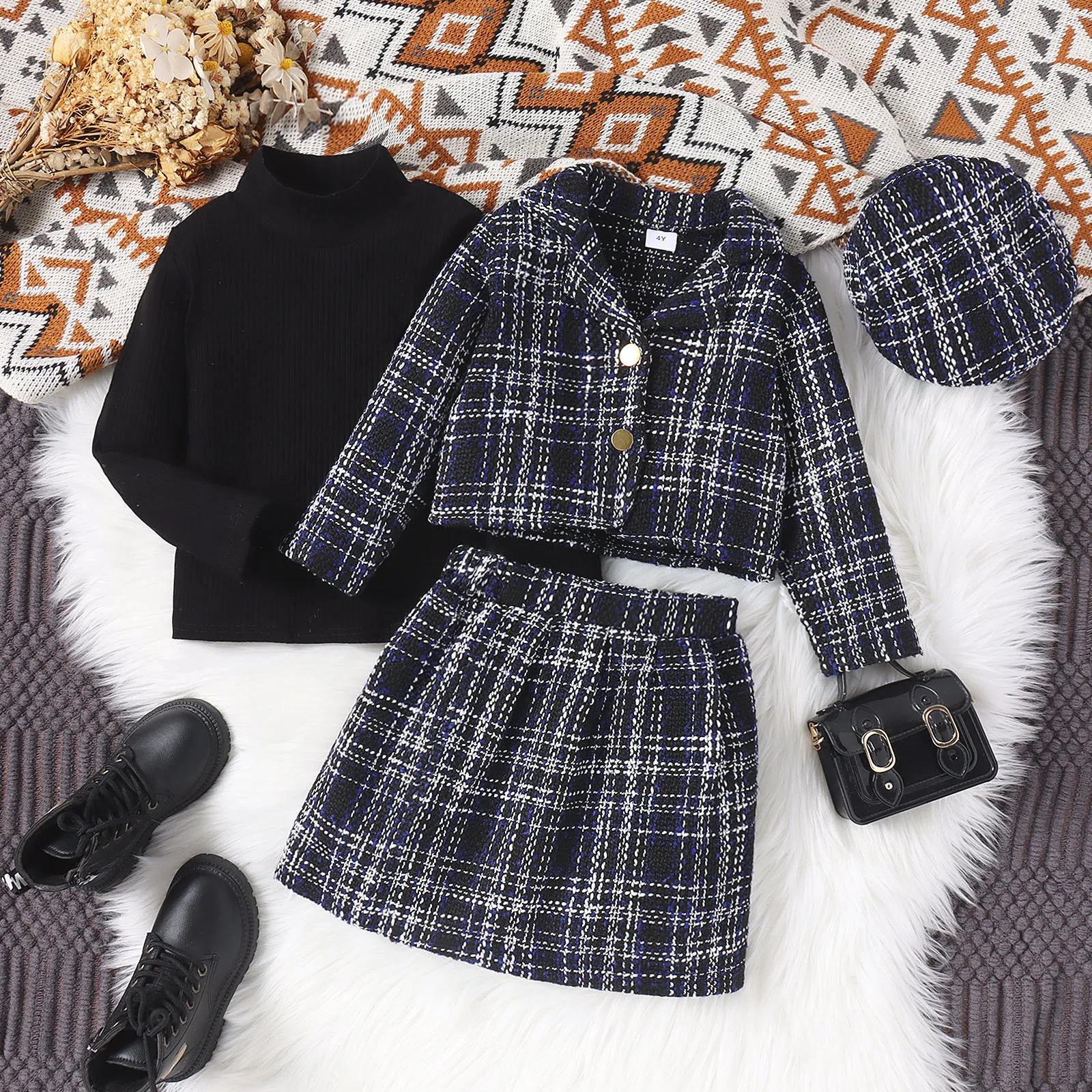 Autumn Winter New Girls High-neck Long-sleeved Top+Tweed Suit Jacket+Skirt+Beret 4Pieces Set Casual Kids Clothing Age 3T-8T