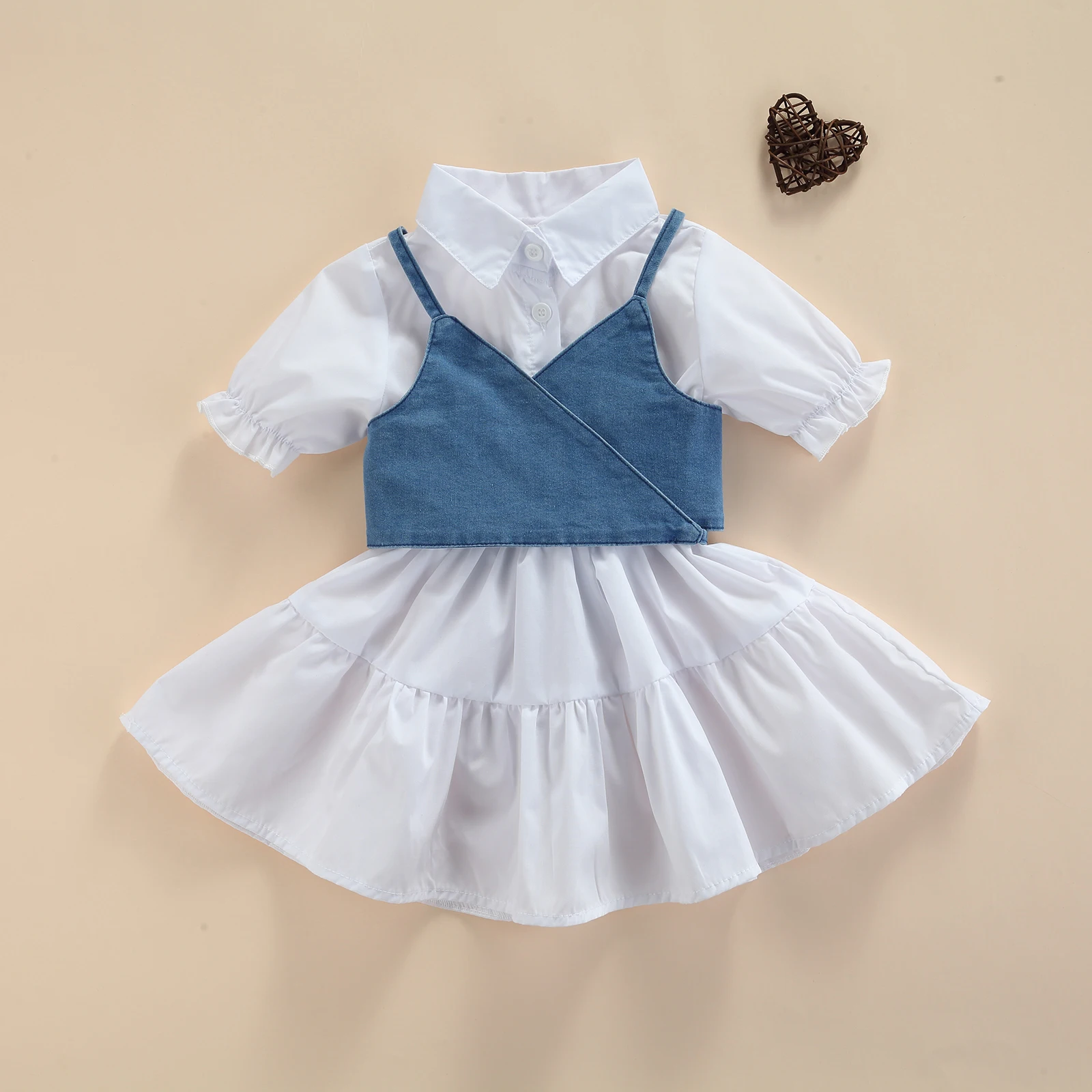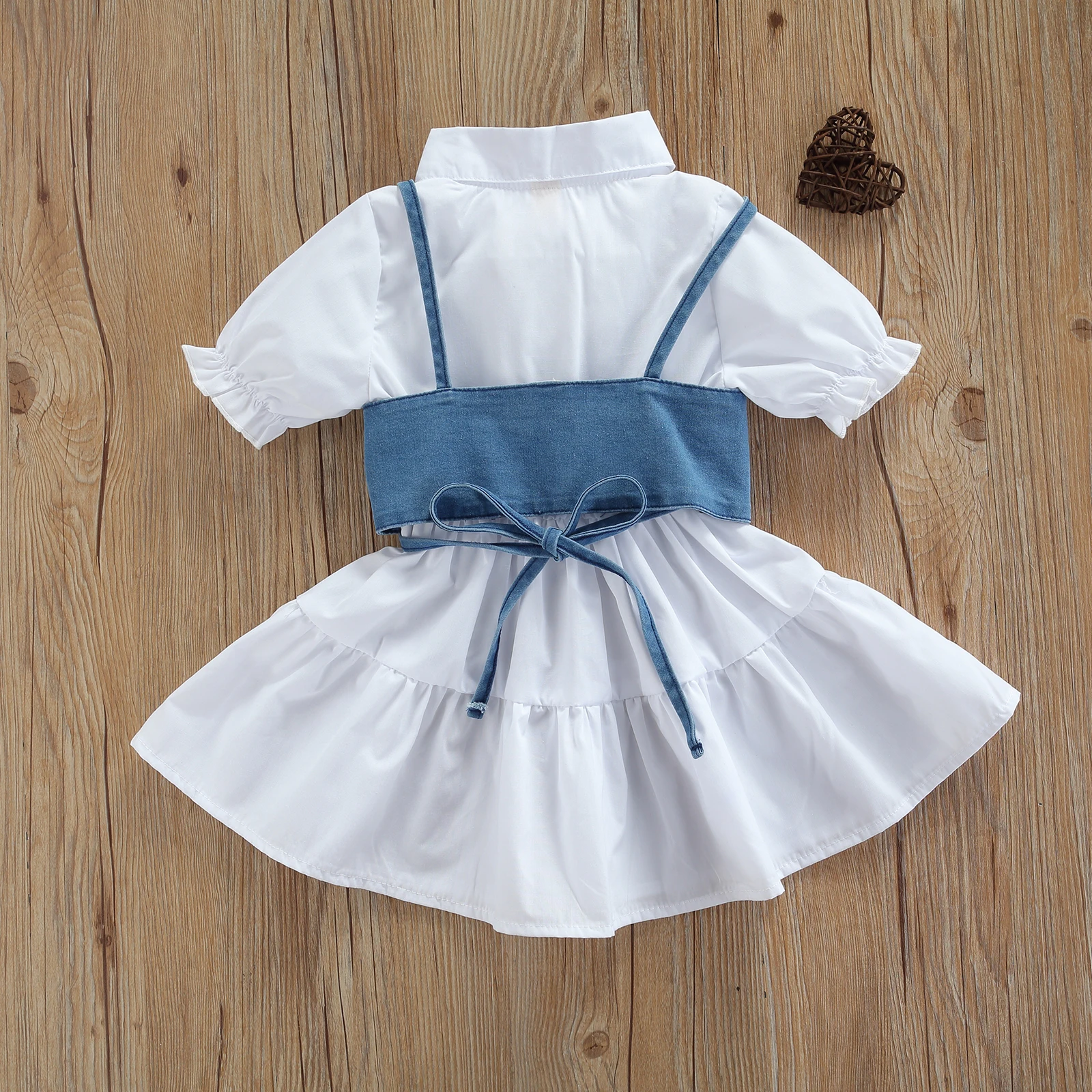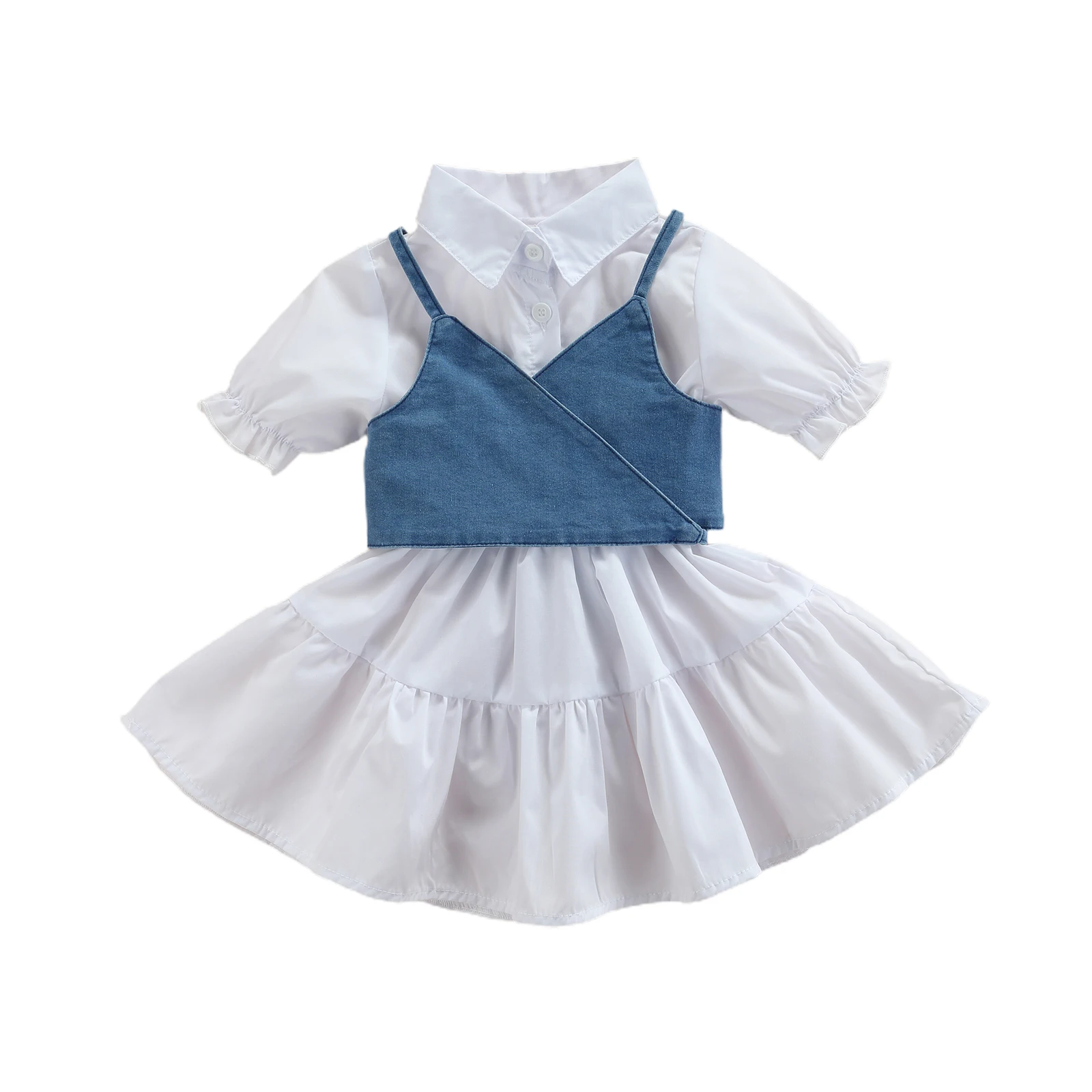 This children’s short-sleeved dress is a summer outfit with a denim vest, with a simple style of single-breasted design.