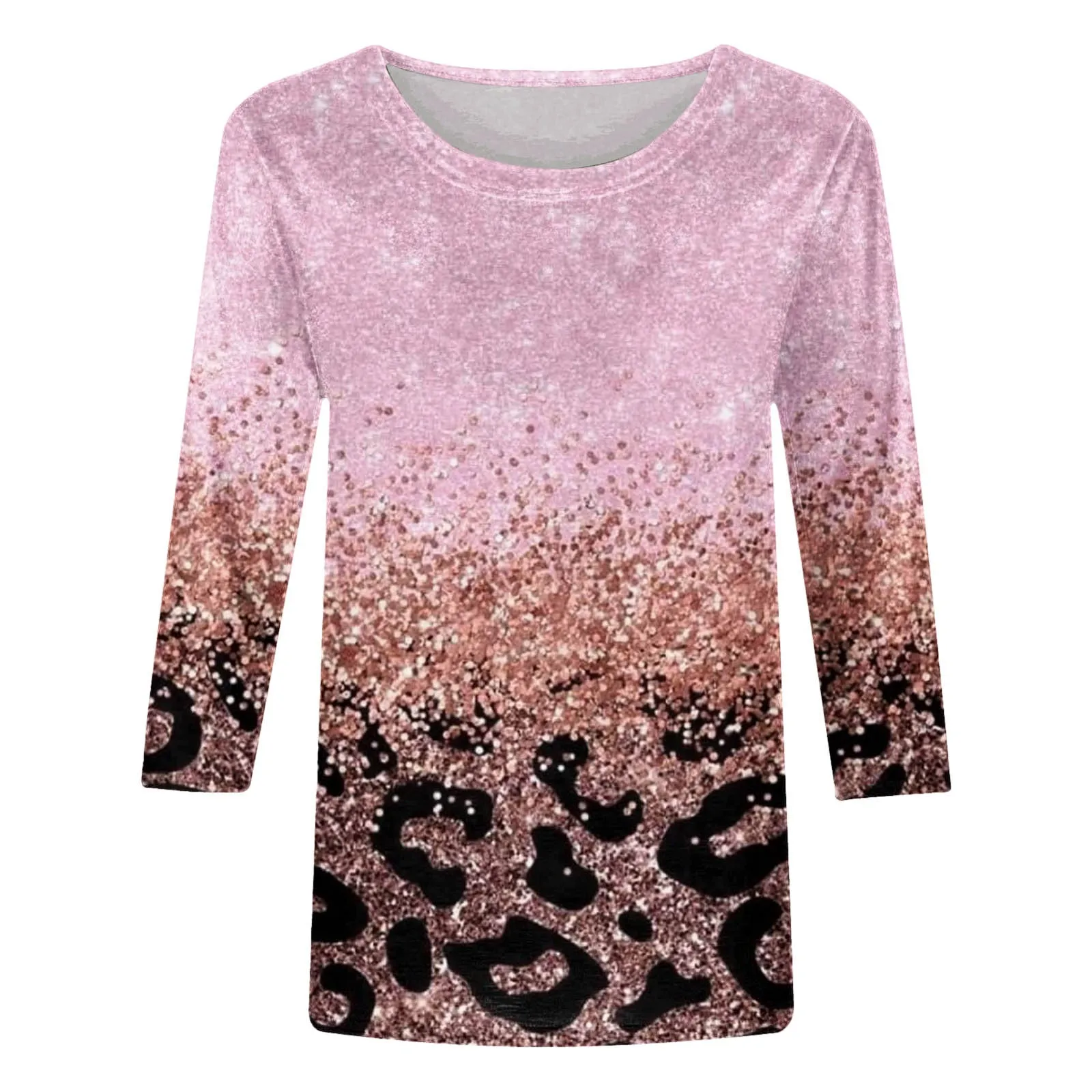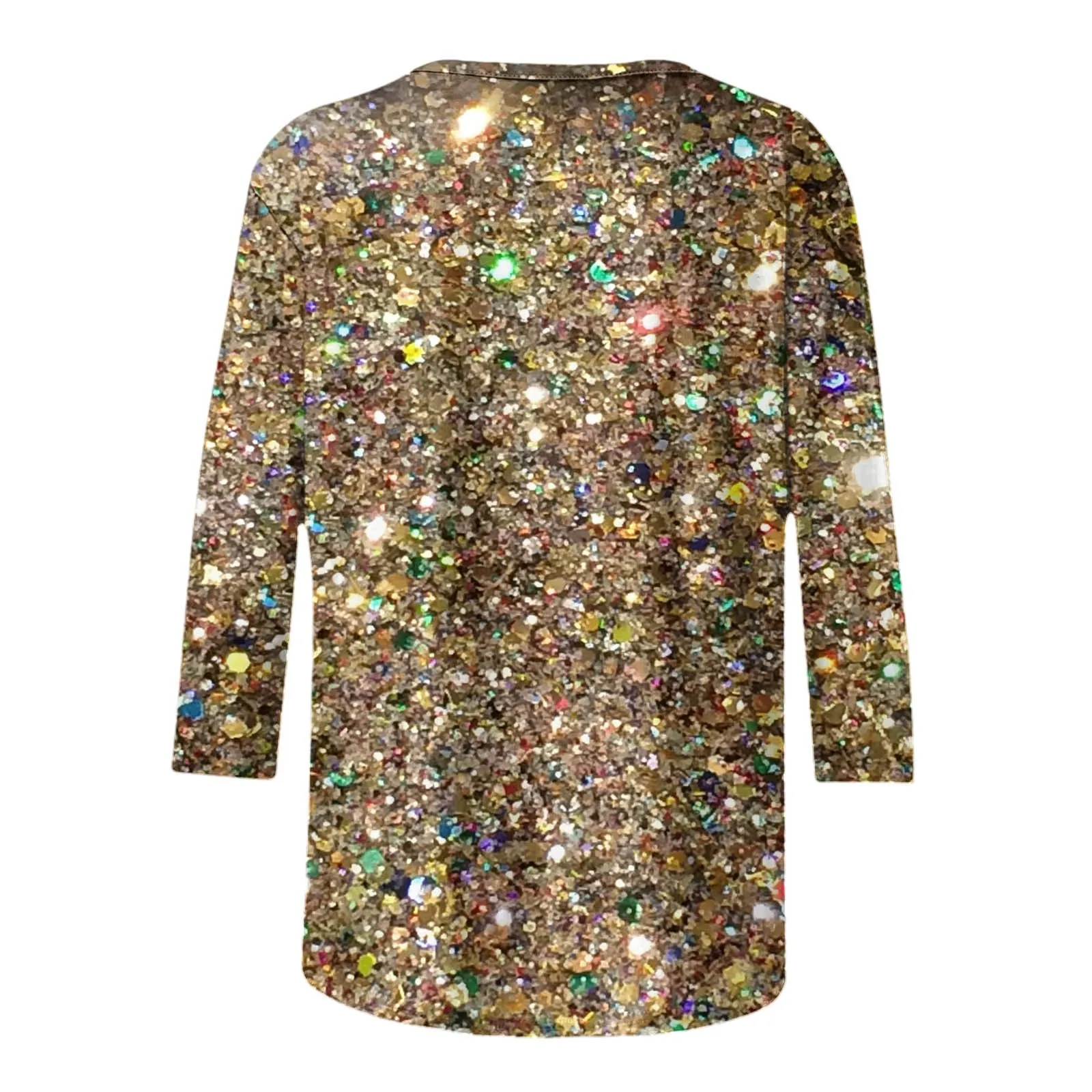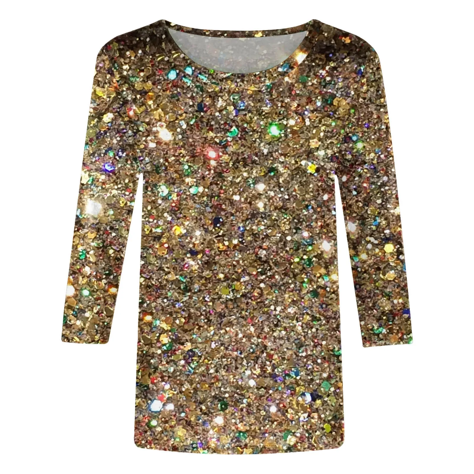 Women’s Sequin Casual Printed Round Neck Loose Sleeved Quarter Sleeved T-shirt Top