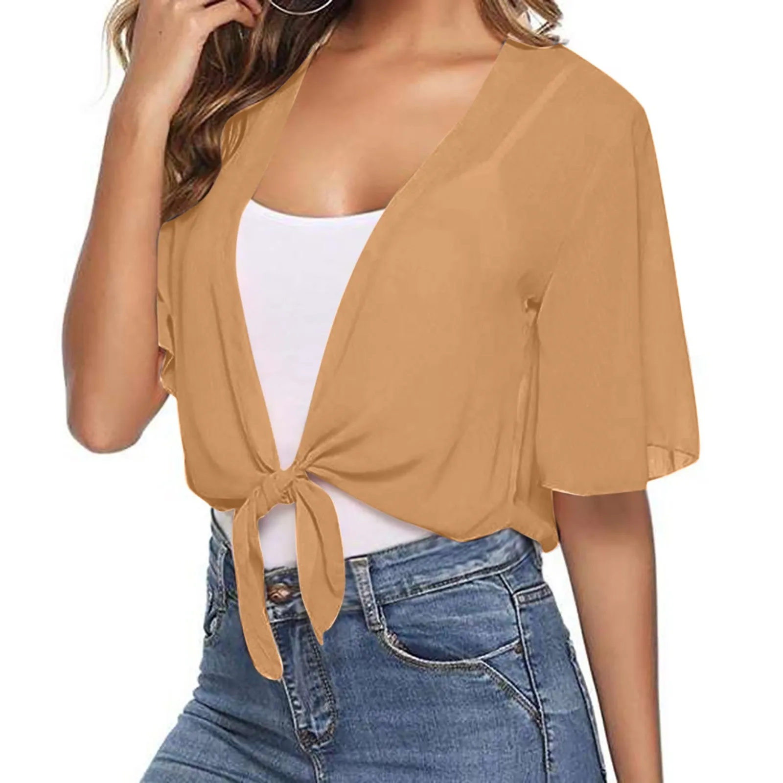Women Tie Front Chiffon Short Sleeve Cropped Sheer Bolero Cardigan